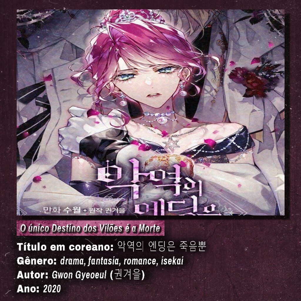 “O Único Destino dos Vilões é a Morte” é um manhwa que combina drama, fantasia e romance com uma pegada sombria e envolvente. A história acompanha uma protagonista que desperta dentro de um mundo desconhecido, assumindo o papel de uma vilã destinada a morrer — a menos que consiga mudar seu futuro.